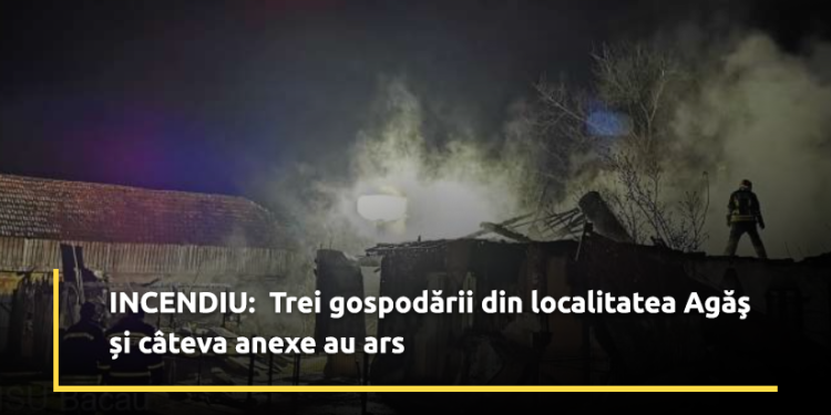 Trei gospodării din localitatea Agăş au fost cuprinse, marţi seara, de un incendiu, potrivit informaţiilor furnizate de purtătorul de cuvânt al ISU Bacău, maiorul Andrei Grecu.