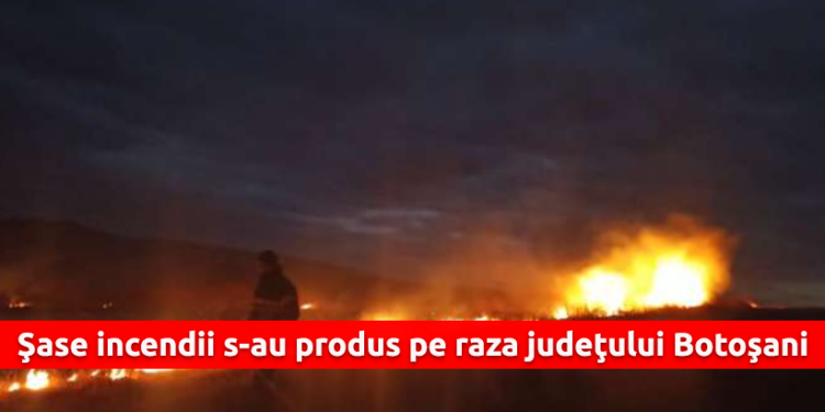 Şase incendii s-au produs, sâmbătă, pe raza judeţului Botoşani, pentru stingerea acestora intervenind 33 de pompieri militari şi voluntari, a anunţat purtătorul de cuvânt al Inspectoratului pentru Situaţii de Urgenţă (ISU), Dorina Lupu.