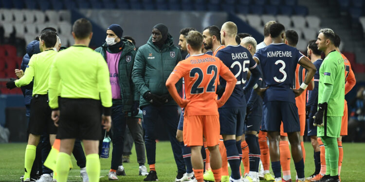 Staff-ul campioanei Turciei şi jucătorii acesteia, urmaţi de cei ai echipei PSG au luat decizia de a părăsi terenul după eliminarea antrenorului secund al formaţiei din Istanbul, fostul atacant camerunez Pierre Achille Webo, acuzând afirmaţii rasiste din partea arbitrului de rezervă.