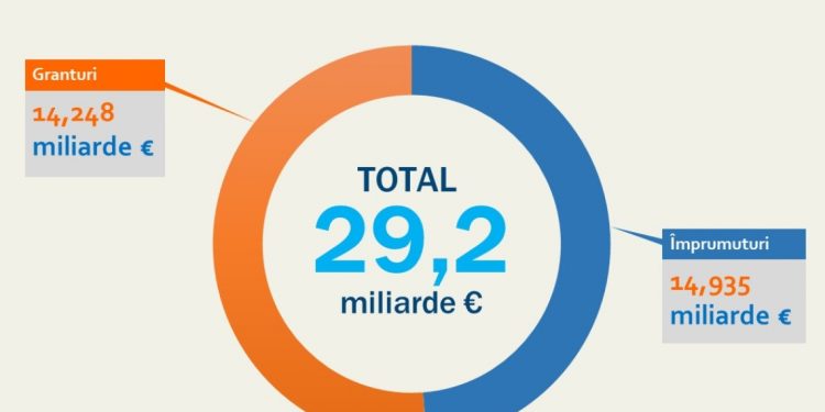 În total, prin PNRR România va beneficia de 29,2 miliarde euro, din care 14,2 miliarde granturi și 14,9 miliarde împrumuturi. Banii se vor acorda în tranșe, în funcție de îndeplinirea unor obiective, numite jaloane și ținte. În total, sunt 507 de jaloane și ținte de realizat până la 31 decembrie 2026.