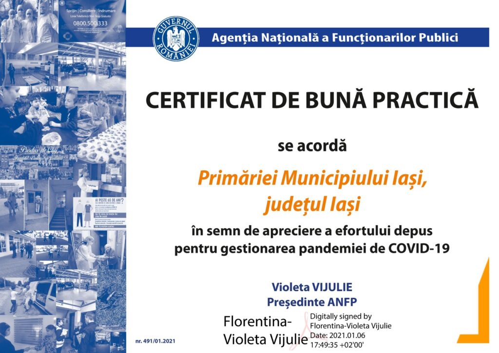 Municipalitatea ieșeană a primit zilele trecute un certificat de bună practică din partea Agenției Naționale a Funcționarilor Publici (ANFP) pentru gestionarea pandemiei de COVID-19.