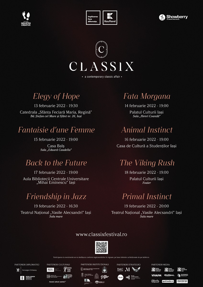 Iași, 9 februarie 2022 – Peste 60 de artiști internaționali din 13 țări sosesc la Iași în perioada 13 – 19 februarie, în cadrul celei de-a treia ediții a Classix Festival. 8 concerte de muzică clasică, 10 cursuri de măiestrie, o expoziție de ilustrații, o dezbatere, o prelegere și 7 proiecții de film își așteaptă exploratorii aventurii clasice contemporane.