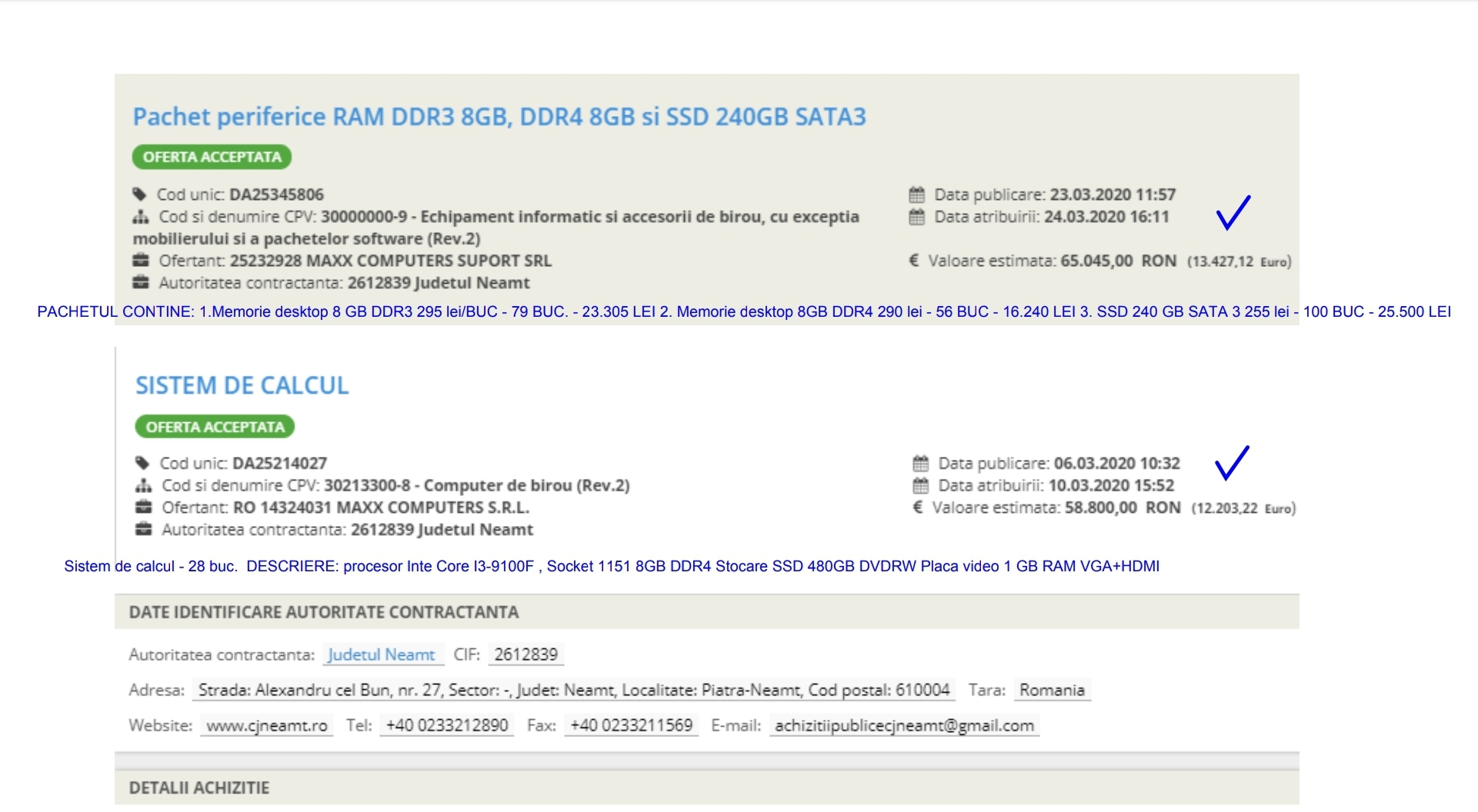 Toate achizițiile se regasesc in SICAP – sistemul de achiziții publice, toate fiind efectuate prin achiziție directă.