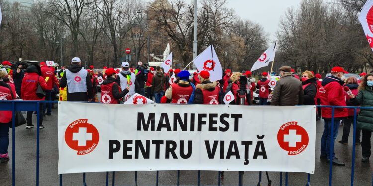 Federația Sanitas din România a protestat astăzi, 1 februarie a.c., în fața Guvernului, pentru respectarea drepturilor angajaților din domeniul sănătății. Astăzi se împlinesc „30 de ani de istorie sindicală plus un an de pandemie”.