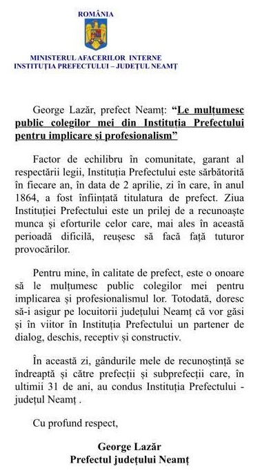 Prefectul județului Neamț, George Lazăr, transmite colegilor lui din Instituția Prefectului, mulțumiri pentru implicarea și profesionalismul lor.