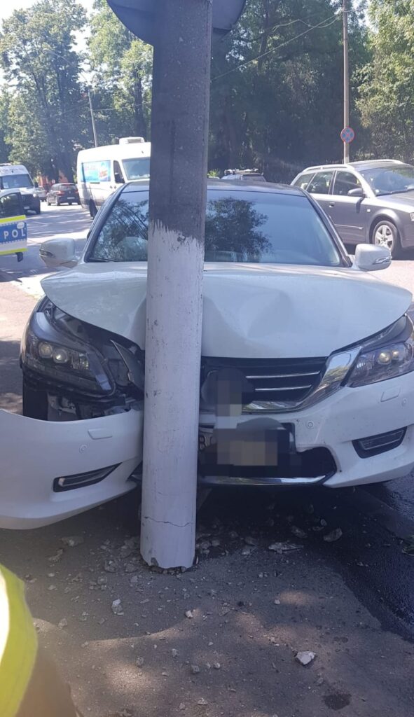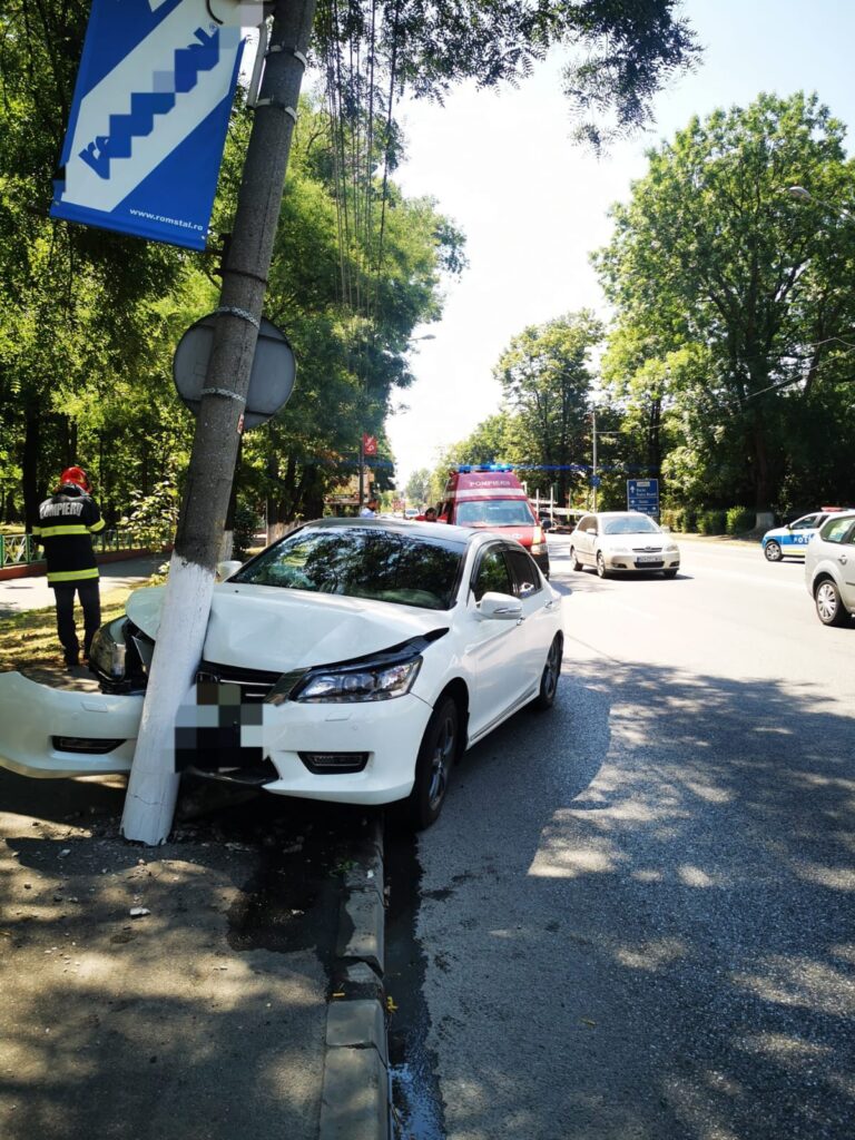 Accident rutier în Roman. Un autoturism a intrat într-un stâlp de iluminat