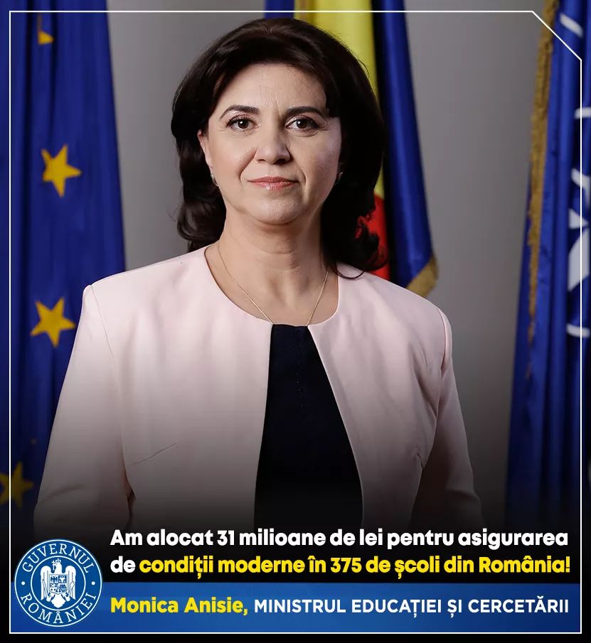 După cum a declarat și Ministrul Educației și Cercetării Monica Anisie, au fost alocați 31.269.000 de lei pentru asigurarea de condiții moderne în 375 de școli din România!
