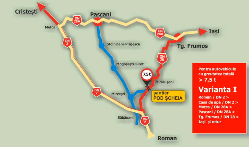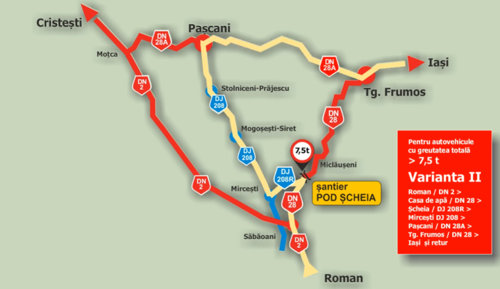 • circulația vehiculelor cu masa totală maxim autorizată mai mare de 7,5 t se va desfășura pe rutele: DN 2 – Casa de apă – Moțca – DN 28A Pașcani – DN 28A Tg. Frumos și retur; DJ 208R Șcheia – DJ 208 Mircești – DJ 208 Mogoșești – DN 28A Pașcani – DN 28A Tg. Frumos și retur;