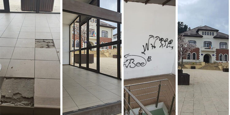 După cum bine puteți observa această intrare a rămas fără geamuri, credem noi că pentru puțin timp cel mai probabil, dar ne înșelăm când vine vorba de „încredere”. Când te apropii și vrei să intri – nu îți dai seama dacă poți folosi ușa, fără geam, sau poți trece direct prin ușă, care îți permite un acces mult mai facil. După ce intri, nu îți dai seama dacă ai putea să cobori pe scări, și alea una da, una ba – sau ai putea folosi liftul(dacă ai noroc să fie funcțional). Cu un plus de valoare adăugată sunt și pereții, aceștia sunt de o mare creație artistică și ne întrebăm dacă se pot valorifica în timp de către primărie sau de către cei care le-au realizat.