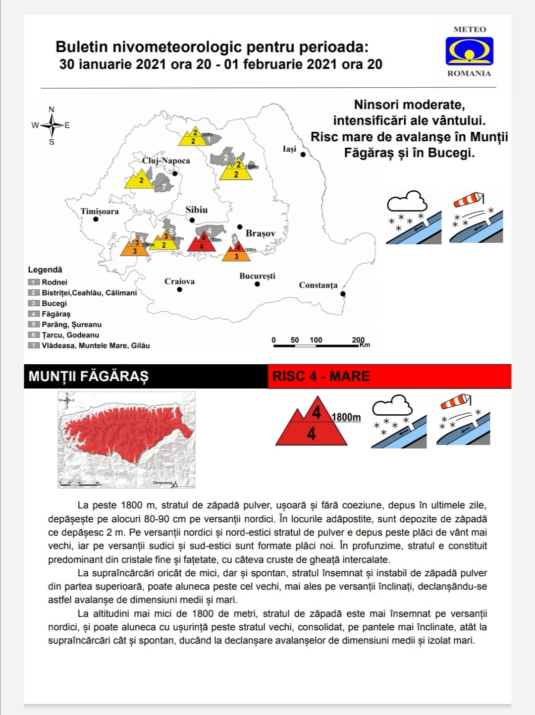 Fenomene meteorologice asteptate: intensificări ale vântului cu rafale de 50-70 km/h, iar la altitudini de peste 1800 m peste 80 km/h, viscolind ninsoarea și determinând scăderea vizibilității sub 100 m.