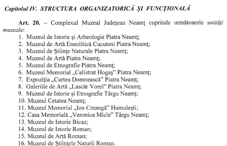 organigrama-31-03-2021Complexul Muzeal Județean Neamț cuprinde mai multe unități muzeale în care în niciuna nu au pregătit un eveniment pentru Noaptea Muzeelor. Se poate vedea mai jos structura organizatorică și funcțională.