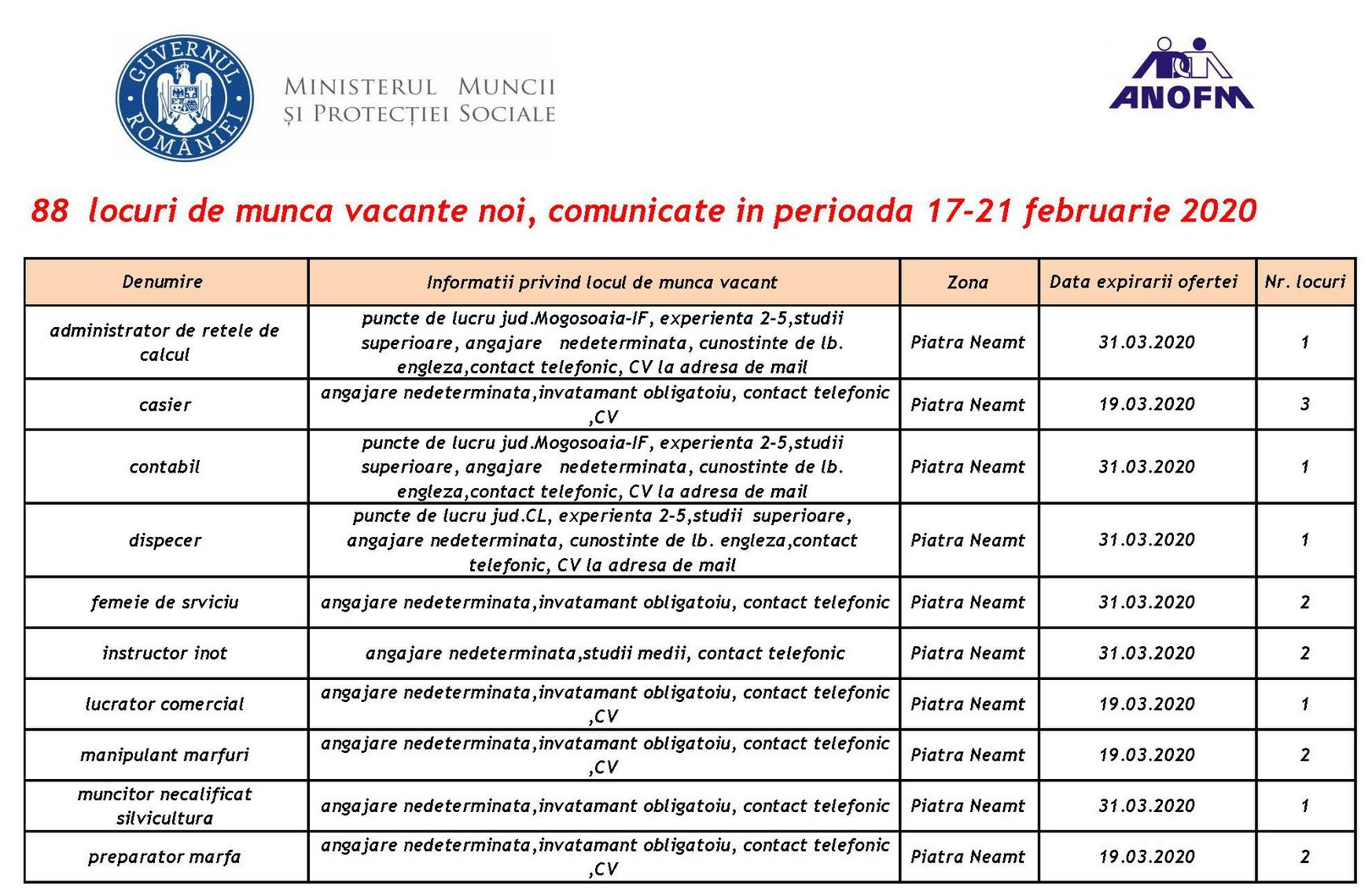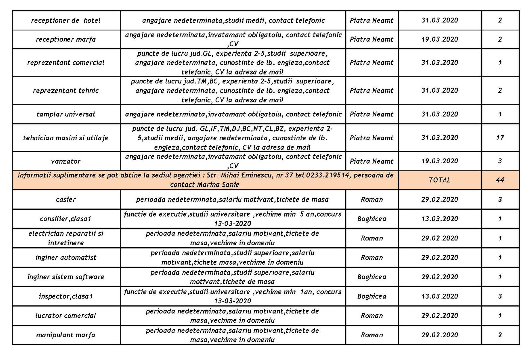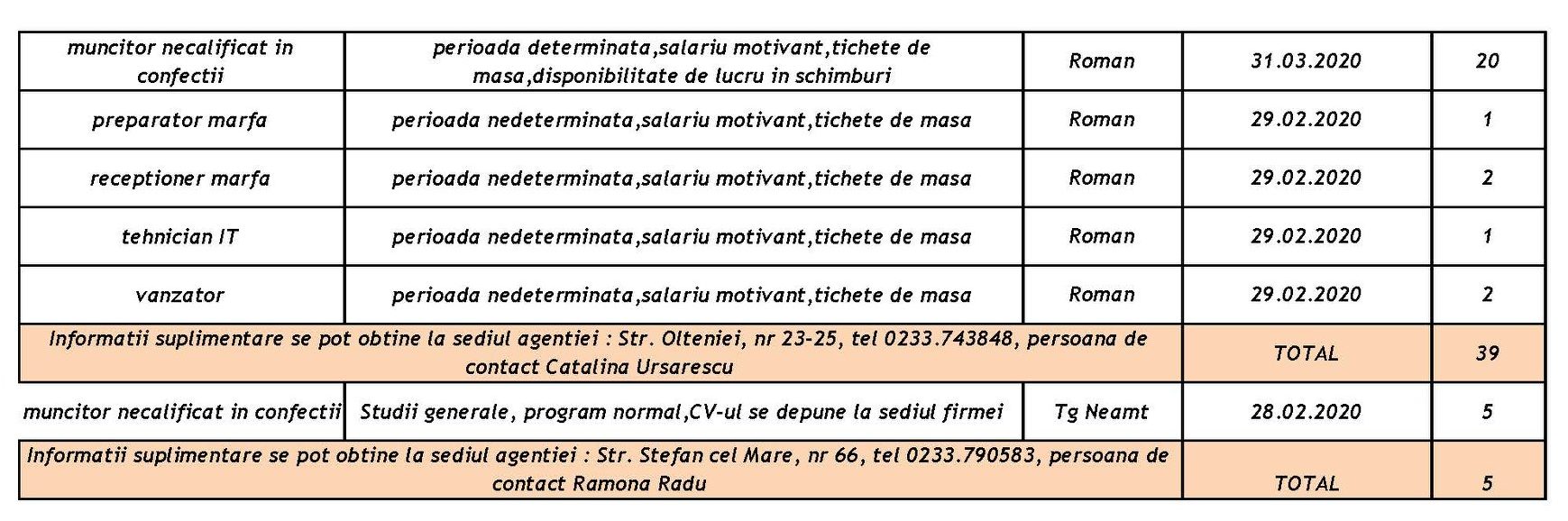 AJOFM anunță noi posturi de muncă, disponibile pentru Piatra-Neamț, Roman și Tîrgu-Neamț.