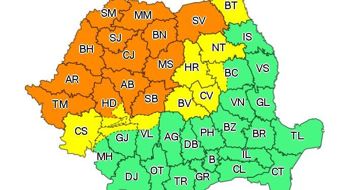 Se vor afla sub această avertizare judeţele Suceava, Maramureş, Bistriţa-Năsăud, Mureş, Satu Mare, Sălaj, Cluj, Alba, Sibiu, Bihor, Arad, Hunedoara (parţial) şi Timiş.