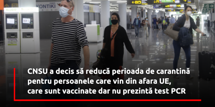 Condițiile de intrare în România au fost modificate, vineri, din nou, de Comitetul Național pentru Situații de Urgență, la doar câteva zile de la adoptarea lor. Astfel, CNSU a decis să reducă perioada de carantină pentru persoanele care vin din afara UE, care sunt vaccinate dar nu prezintă test PCR. Acestea vor sta în carantină 10 zile, în loc de 14 zile. De asemenea, vor fi scutiți de la carantină angajații sistemului național de apărare, ordine publică şi securitate națională care se întorc în România și sunt vaccinați sau trecuți prin boală.
