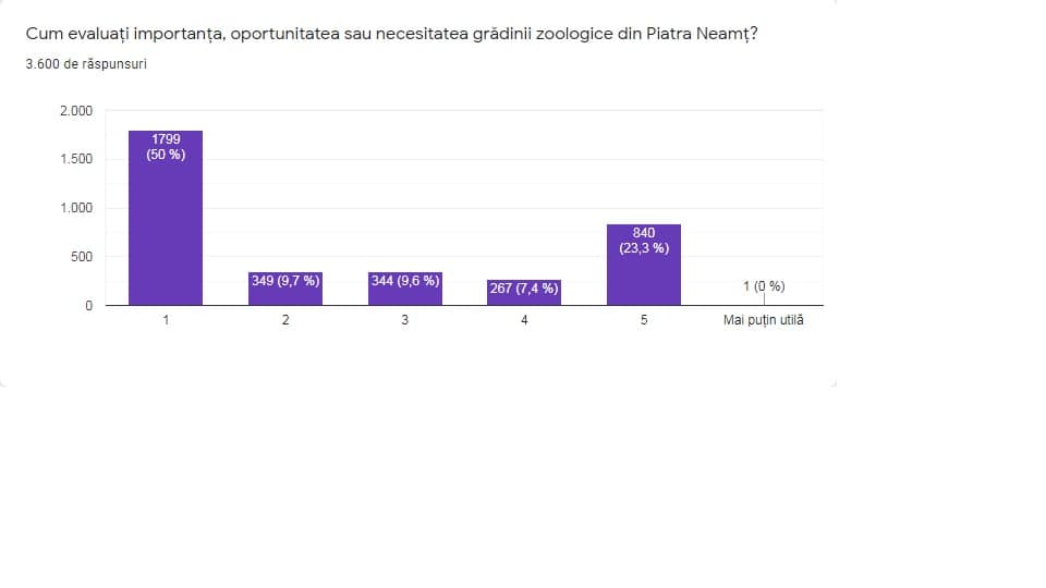 Chestionarul lansat de primarul Andrei Carabelea a fost completat de 3.600 de pietreni. La prima întrebare, pietrenii trebuiau să evalueze importanța sau necesitatea Parcului Zoo. „1799 de cetățeni, respectiv 50% din cei chestionați, au acordat notă minimă, considerând că acest obiectiv nu este important, oportun sau necesar pentru orașul nostru. Doar 840 de respondenți, respectiv 23,3% din cei chestionați, văd oportun și necesar acest obiectiv”, a scris Andrei Carabelea, pe Facebook.