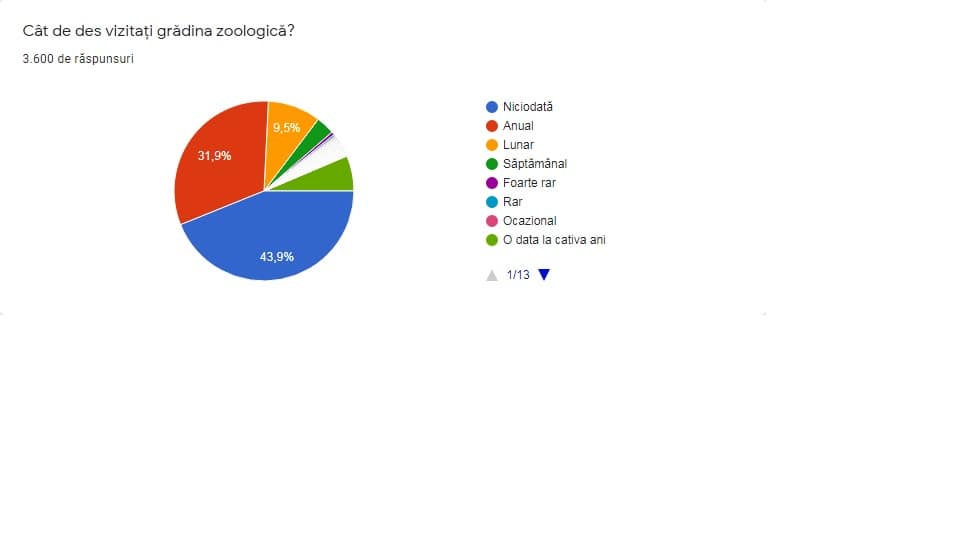 A doua întrebare din chestionar era despre cât de des vizitează pietrenii Grădina Zoologică. Rezultatele arată că 43.9% din locuitori nu au vizitat niciodată Parcul Zoo.
