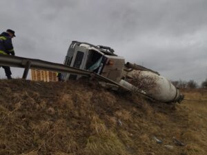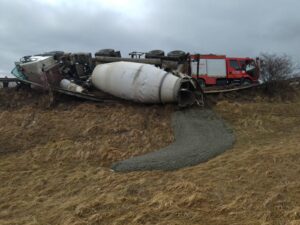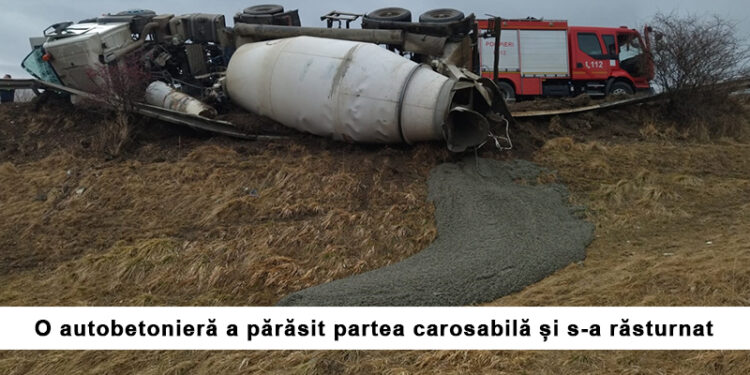 Conform ISU Neamț, o autobetonieră a părăsit partea carosabilă și s-a răsturnat.