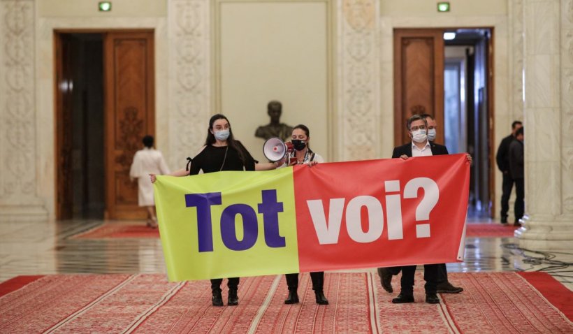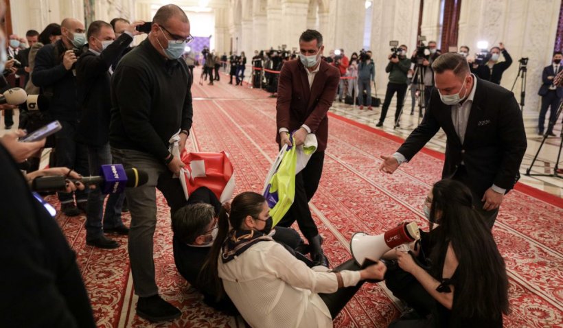 Azi, în timpul votului pentru învestirea Guvernului Ciucă, câțiva reprezentanți ai unor ONG-uri s-au întins pe jos pentru a protesta la învestirea noului Guvern.